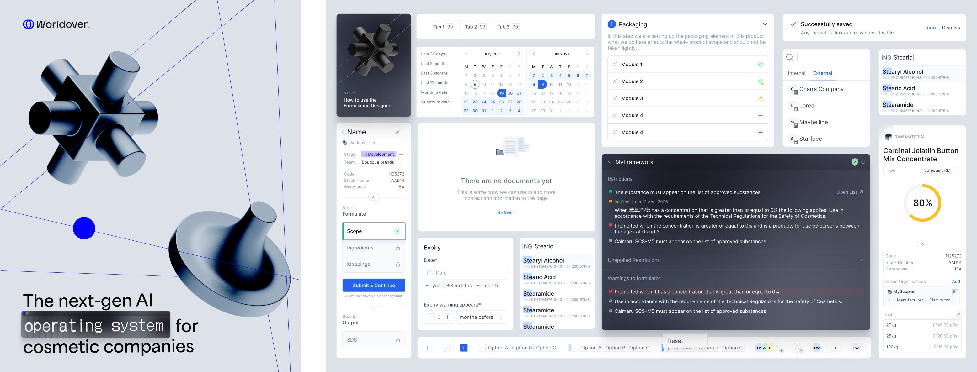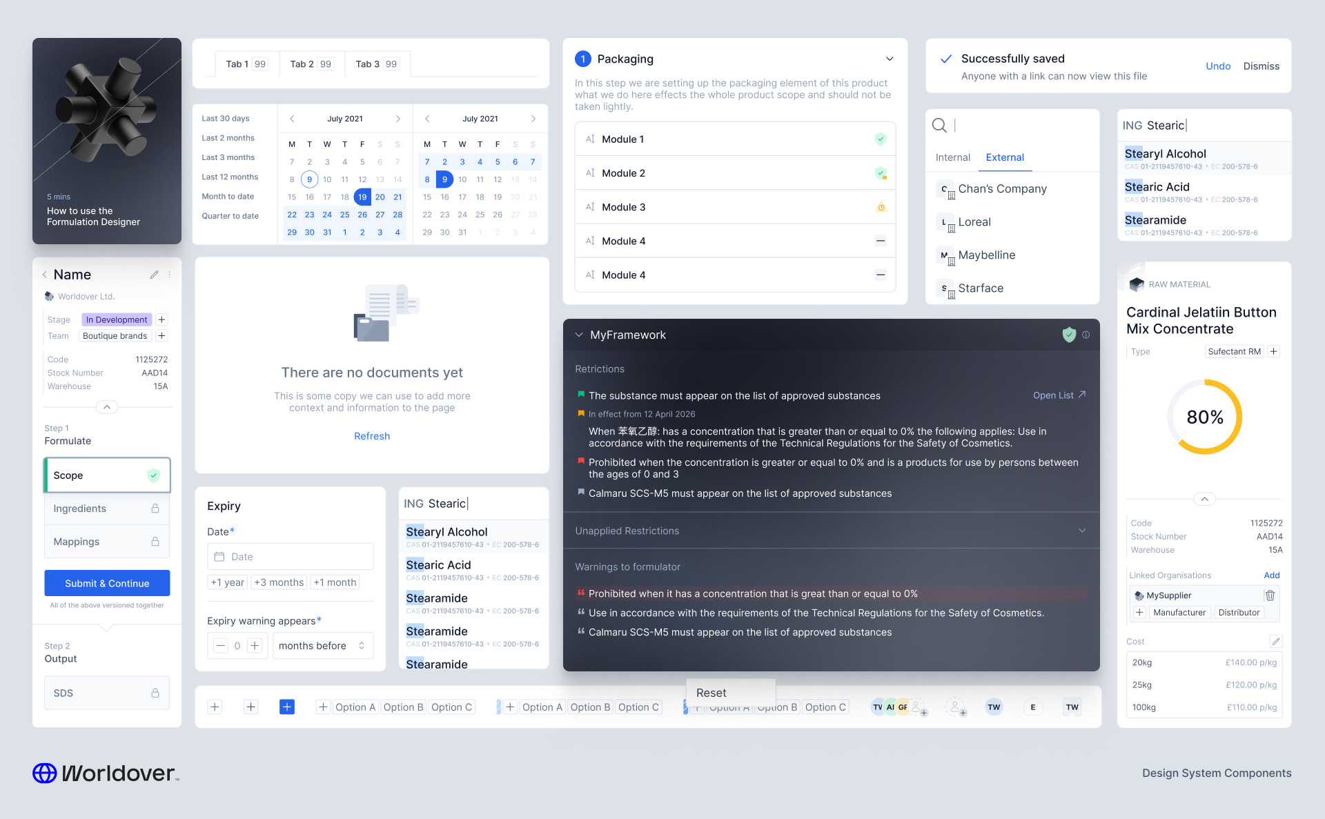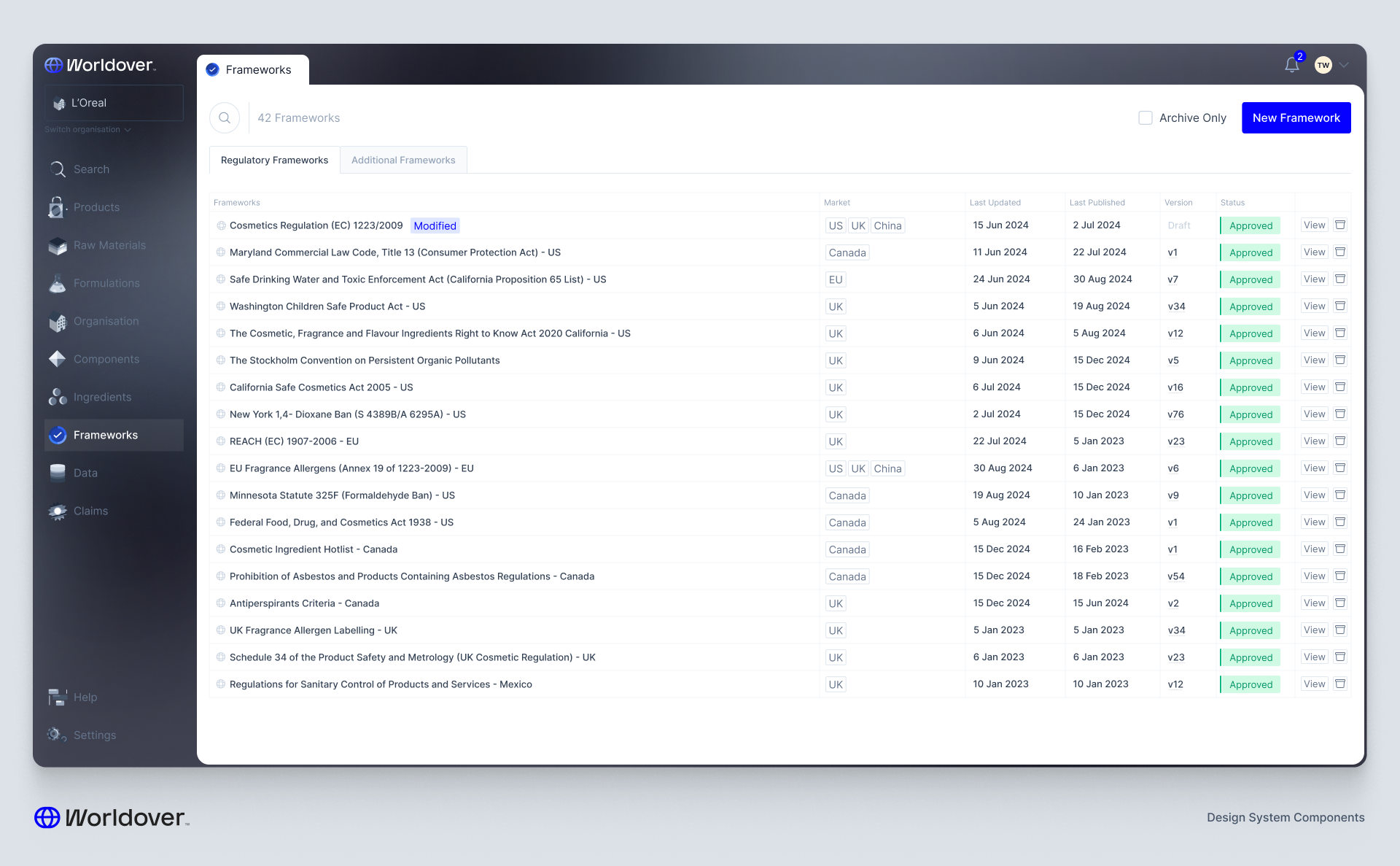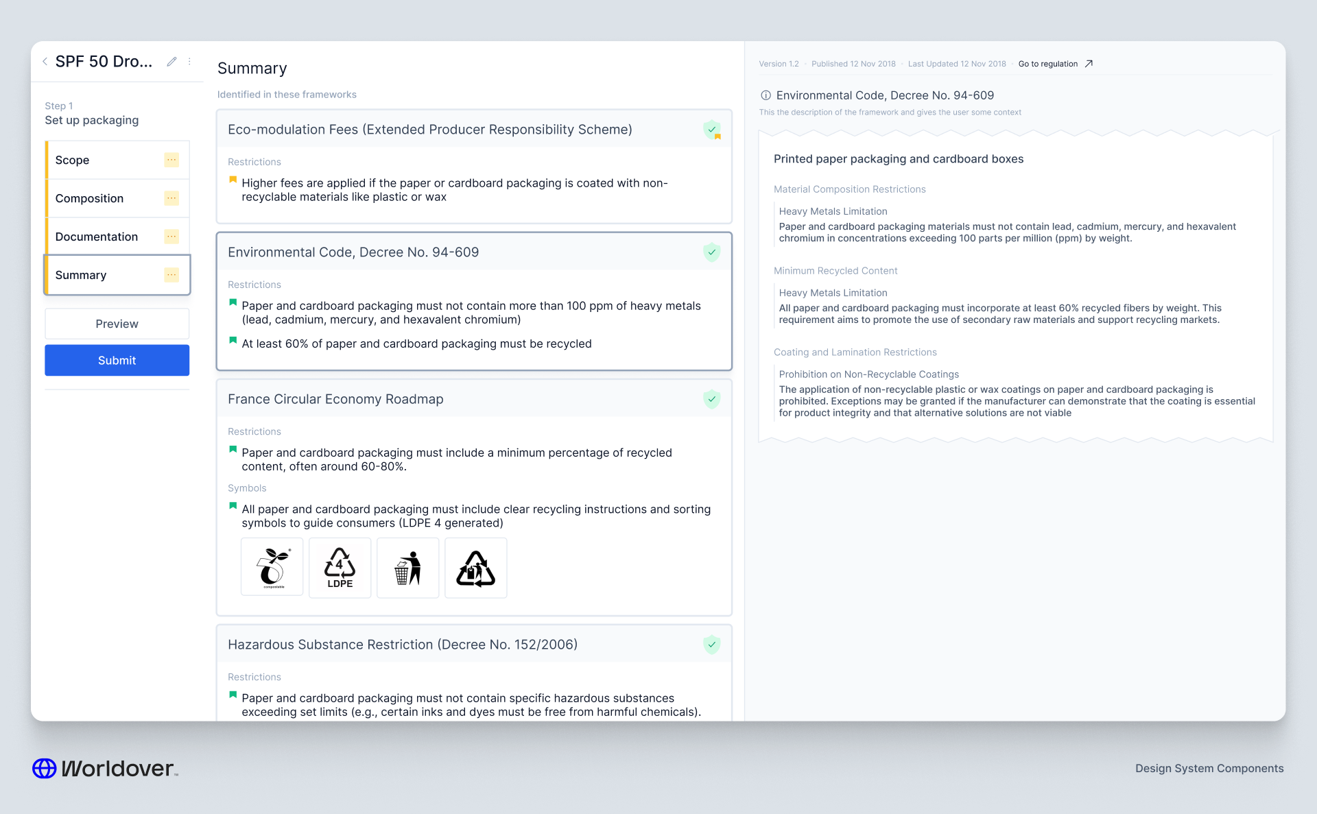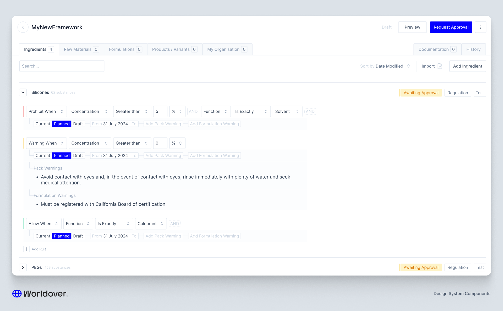 Our client wanted to own that process. They wanted to be able to build their own compliance frameworks — sets of rules that, when applied to an entity like a formulation or a piece of packaging, would flag a violation if something didn't pass.