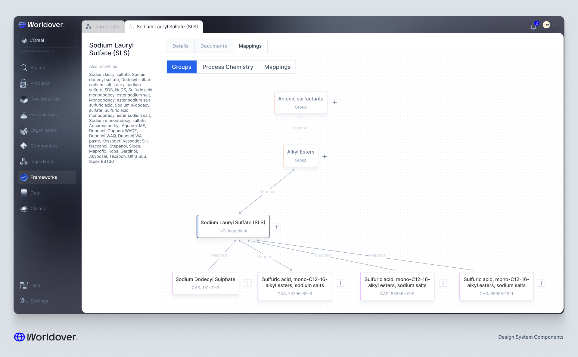 But the design challenge was immediately obvious: ingredients are nested. Deeply nested. Think Silicones → Silicone Elastomers → Dimethicone Crosspolymer. And frameworks can be applied to any entity type in the system, each with their own nuances and edge cases.